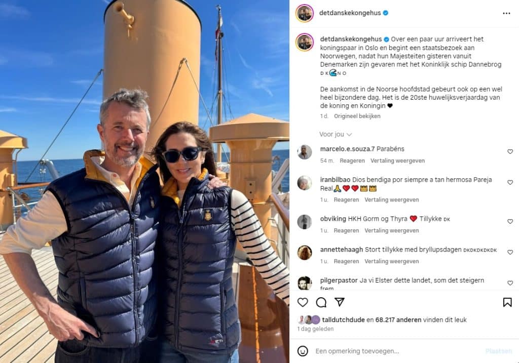 ‘Over een paar uur zal het echtpaar in Oslo arriveren en zal hun staatsbezoek in Noorwegen van start gaan. Maandag vertrok de koning vanuit Denemarken met het koninklijke schip Dannebrog’, klinkt het onder een lieve foto van het koppel op de boot. ‘De aankomst in de Noorse hoofdstad gebeurt op een heel bijzondere dag. Het is de twintigste huwelijksverjaardag van de koning en de koningin.’