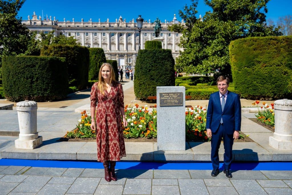 Prinses Amalia heeft maandag onverwacht een bezoek gebracht aan Madrid, waar ze een speciale plaquette onthulde bij haar eigen tulpentuin.