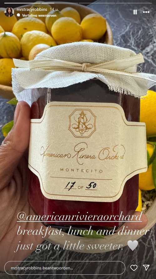 “Ontbijt, lunch en diner zijn zojuist een beetje zoeter geworden”, schrijft de Amerikaanse modeontwerpster Tracy Robbins deelt in haar stories. In haar Instagramstory is een foto van de pot te zien met een crèmekleurige etiket. Daarop is de naam van het merk te lezen en ook dat het nummer 17 van 50 is.