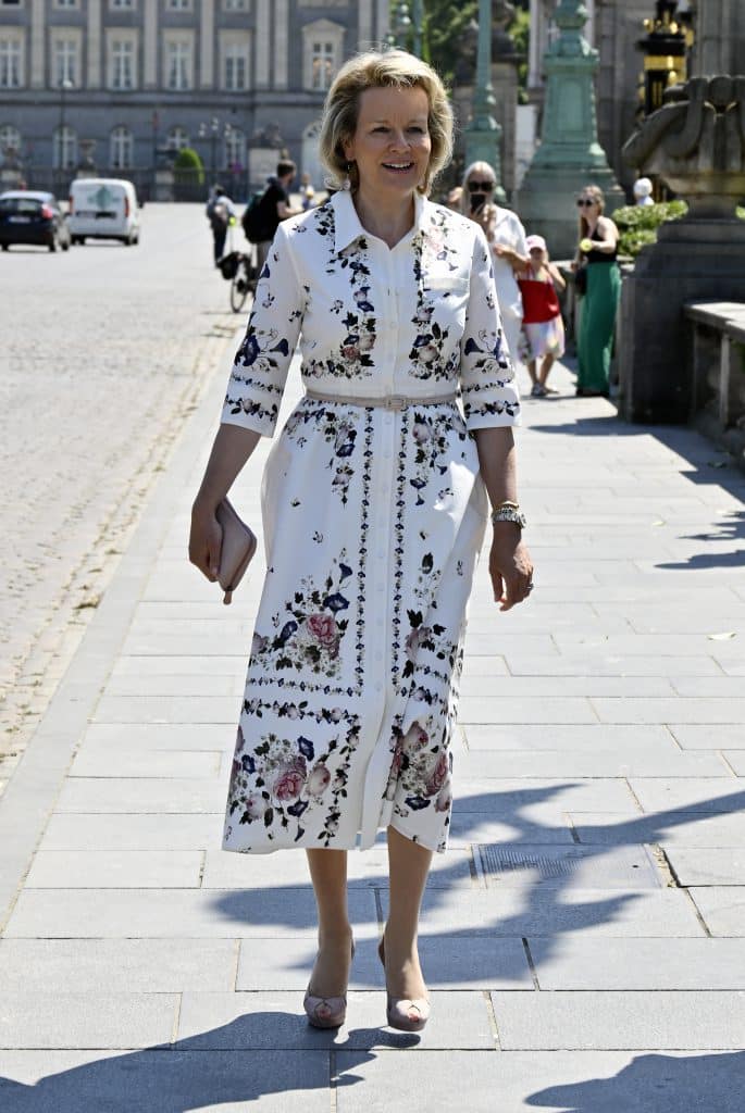 Koningin Mathilde had voor een serieuze powerlunch in Brussel gekozen voor een mooie en zeer zomerse outfit.