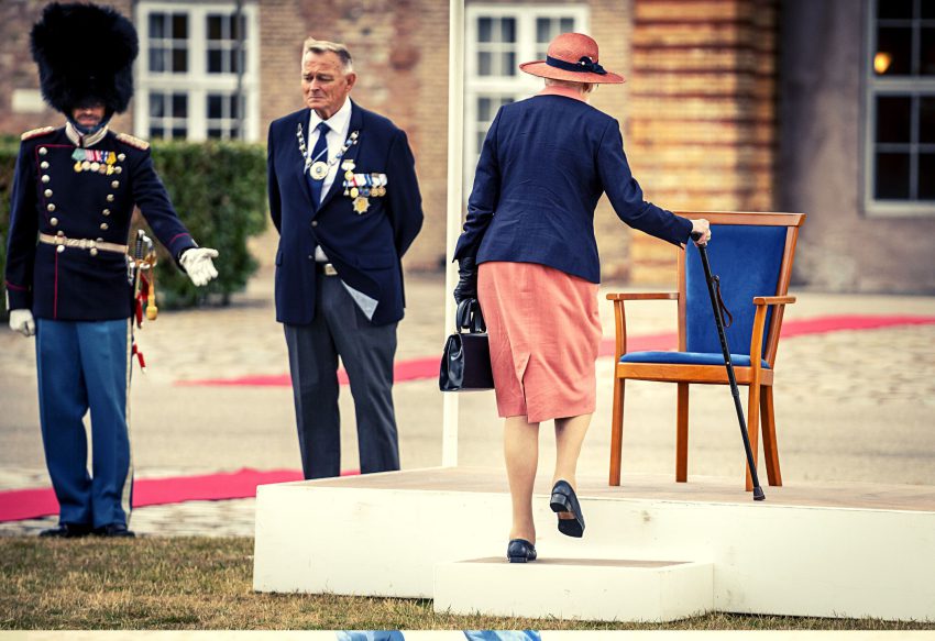 Margrethe zag er opgewekt uit, maar kan nog steeds niet zonder stok en stoel, sinds ze in februari een rugoperatie onderging.