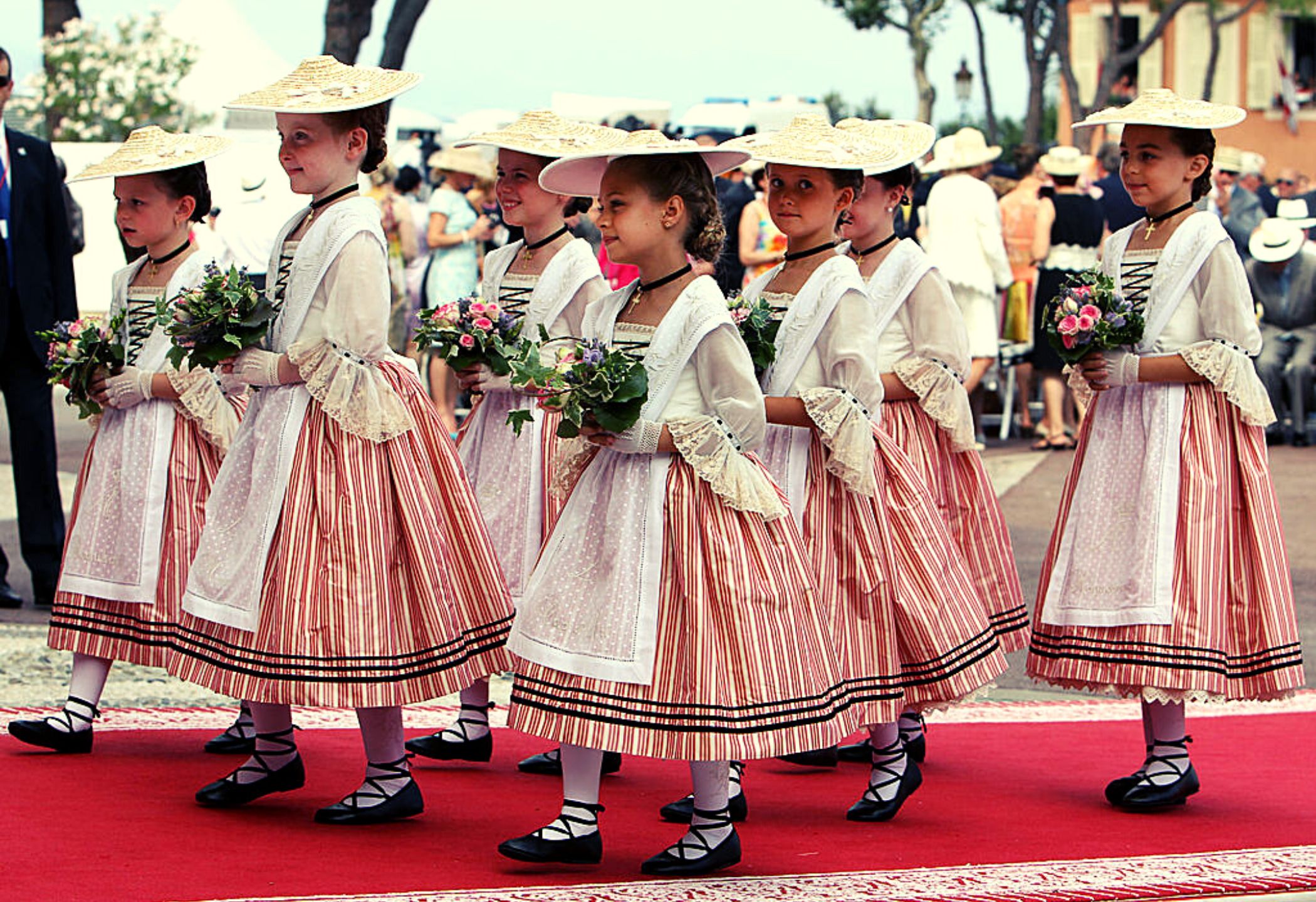De outfits van de bruidsmeisjes, ontworpen door haar schoonzus prinses Caroline en de directeur van de Ballets de Monte-Carlo, bestonden uit witte topjes met kanten mouwtjes, rood gestreepte volle A-lijn rokken en witte schortjes, die gepersonaliseerd waren met het monogram van het paar en de streek van Monaco waar elk meisje vandaan kwam.