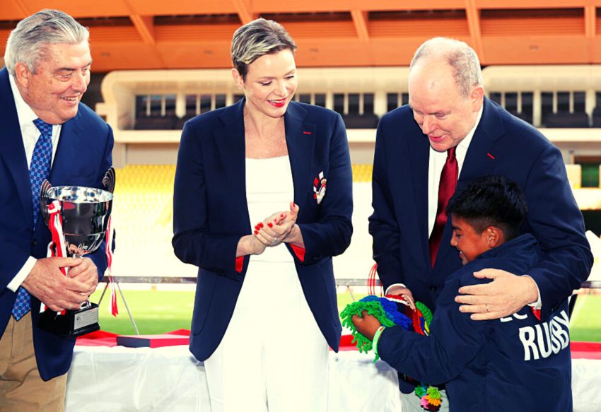 Deze foto is precies het tegenovergestelde. Kijk dan hoe Albert de winnaar van een rugbywedstrijd in de armen sluit. De overgelukkige jongen krijgt uit handen van de prins een sjaal. En daarna ook nog een beker.