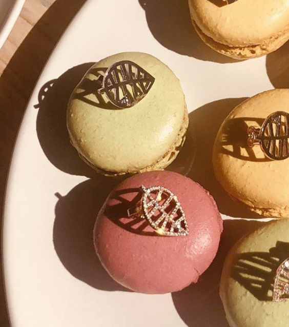 Prinses Margarita heeft een voorliefde voor organische, natuurlijke vormen. Blaadjes komen bijvoorbeeld veel terug in haar ontwerpen. Kijk eens naar deze mooie oorstekers, leuk gefotografeerd op de kleurrijke macarons.