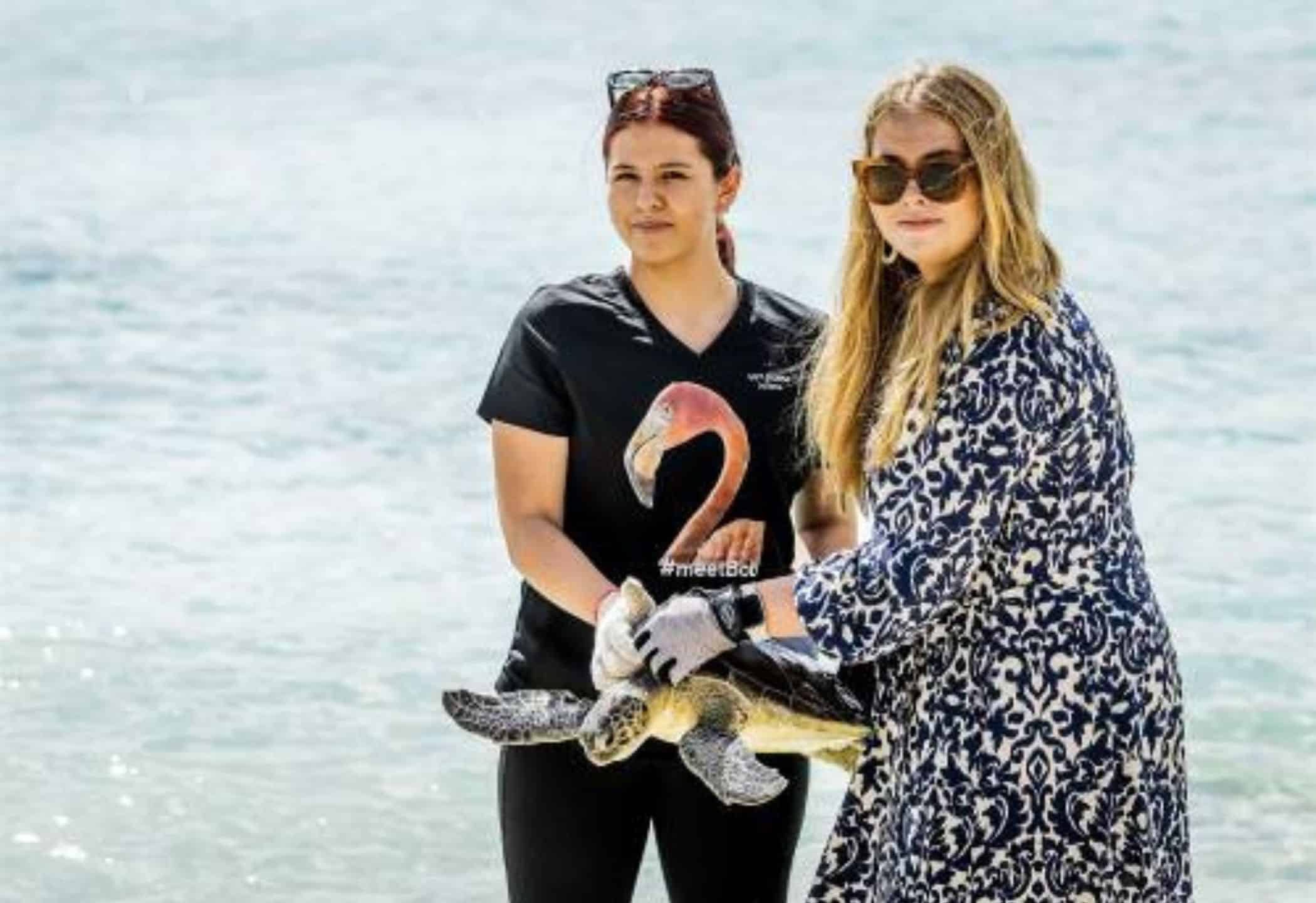 De schildpad verbleef bij Sea Turtle Conservation Curaçao en was net hersteld van vijf tumoren. Op teenslippers – met blarenpleisters op haar enkels, vermoedelijk van de hoge hakken die ze de afgelopen dagen heeft aangehad – bracht Amalia het dier samen met een begeleider naar de zee.