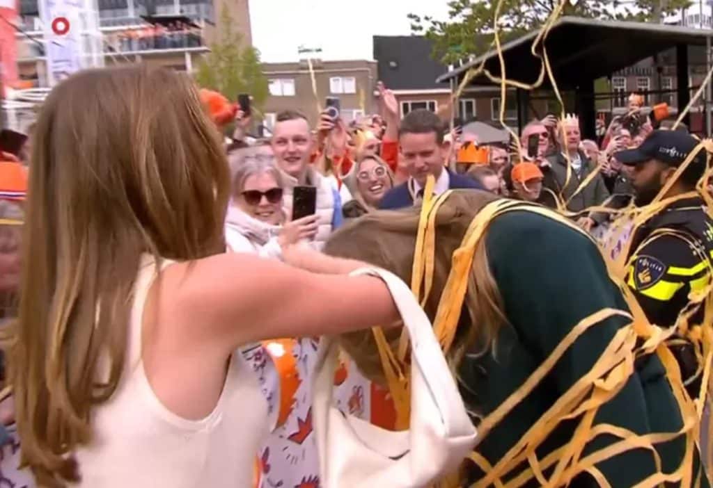 Amalia was duidelijk verrast door de ‘regen’ van oranje slingers. Haar zus Alexia snelde meteen toe om haar te helpen, gevolgd door de persoonlijk assistent van de prinsessen en de grootmeesteres van de koning. Gelukkig kon Amalia er zelf wel om lachen. Daarna ging ze verder met haar tour langs het publiek en de Emmense volkszanger Jannes.