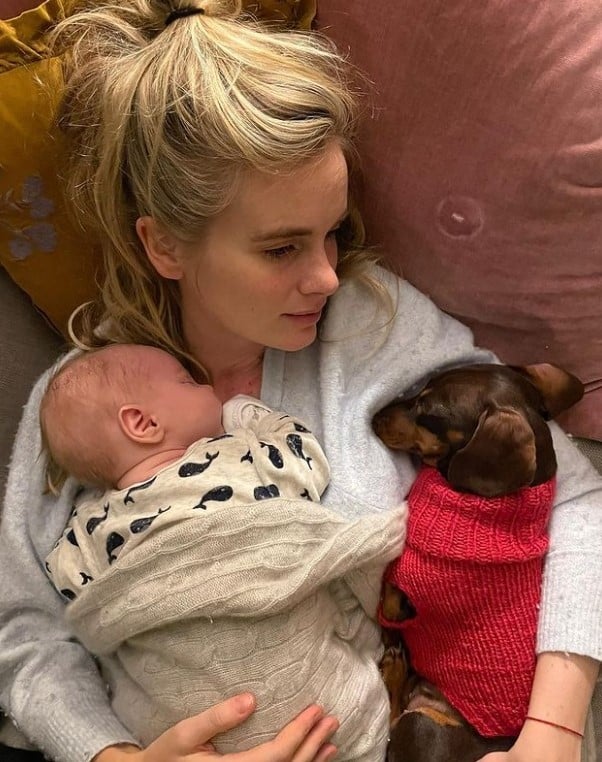 Op de foto ligt Cressida Bonas op haar bank, met haar baby tegen zich aan en haar hondje Budgie Bear in haar armen. ‘Ik verwelkom 2023 met deze twee schatten. Gelukkig nieuwjaar iedereen,’ schreef ze erbij.