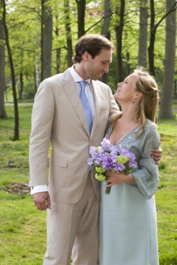 Haar huwelijksdag met Tjalling, in 2008. In 2001 – toen ze met Edwin trouwde – droeg ze een witte bruidsjapon, maar hier koos ze een lichtblauwe japon van ontwerper Frans Hoogendoorn.