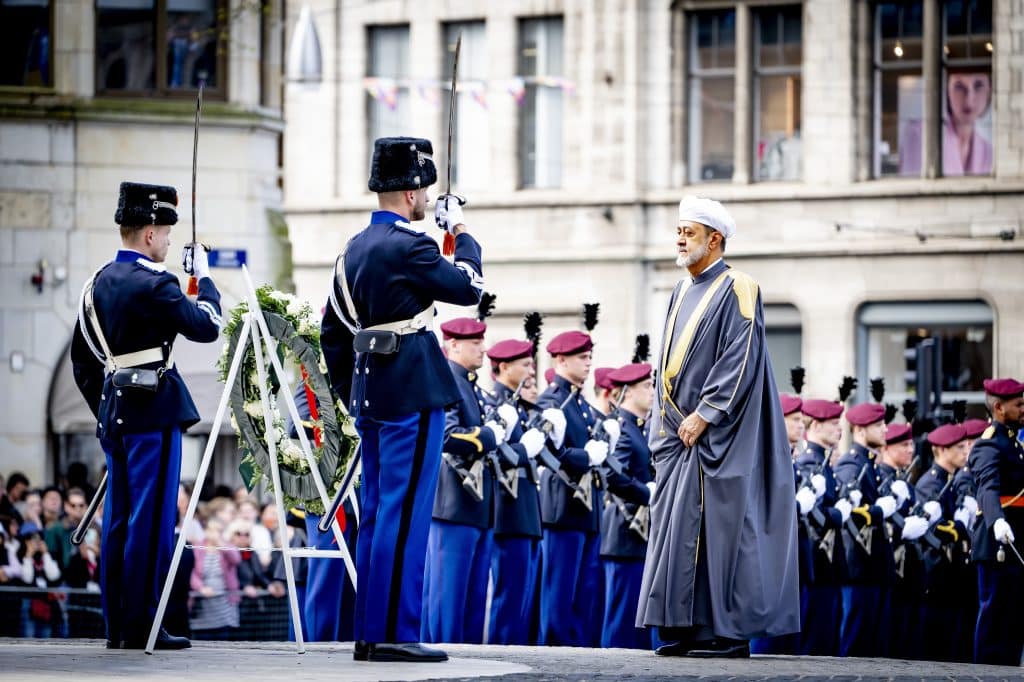 Eerder op de dag vond op de Dam een officiële welkomstceremonie plaats. De sultan legde een krans bij het Nationaal Monument en woonde een receptie bij in het paleis. In de middag spraken koning Willem-Alexander en de sultan met vertegenwoordigers van Nederlandse bedrijven met interesse in samenwerking met Oman.