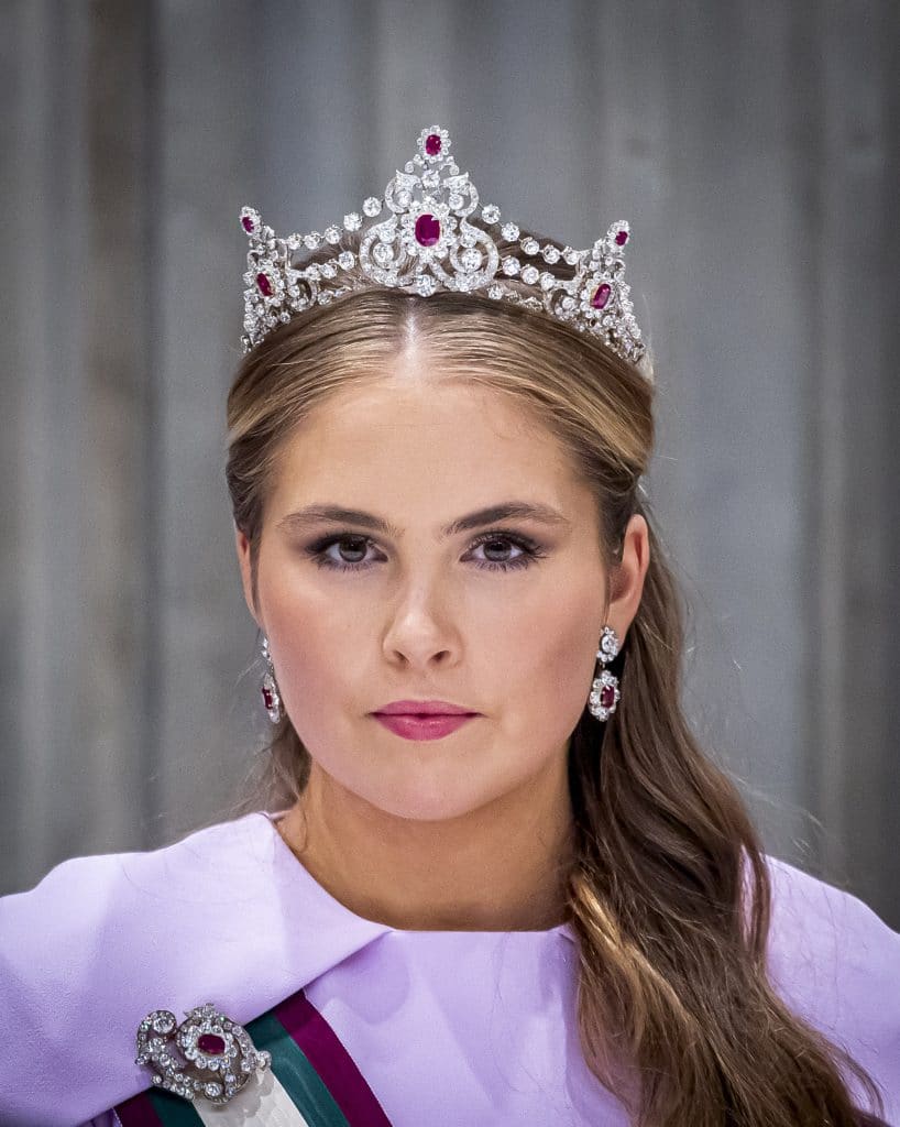 Prinses Amalia verscheen op haar derde staatsbanket in een lila capejurk van het Britse merk Safiyaa. Ze droeg daarbij het robijnen Mellerio-diadeem, een juweel dat in 1888 werd besteld door koning Willem III bij de Franse juwelier Mellerio dits Meller.