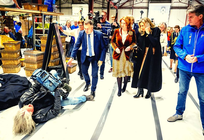 Toen ineens: grote schrik. Je ziet dat Máxima met haar handen naar haar hoofd grijpt. Een cameraman die het koninklijke bezoek vastlegde was gestruikeld en gevallen.