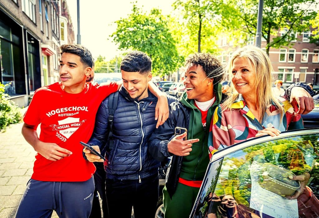 Toch kan het soms schuren, zoals op deze foto, waar met name één jongeman wel heel erg amicaal omgaat met koningin Máxima. Die wel weer zo professioneel is dat ze het klein houdt. Wat niet wegneemt dat zelfs buitenlandse media hier aandacht aan besteedden.
