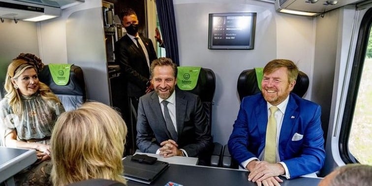 Tijdens de reis naar de laatste stop van het staatsbezoek aan Oostenrijk, schoof ook minister De Jonge aan bij koning en koningin.