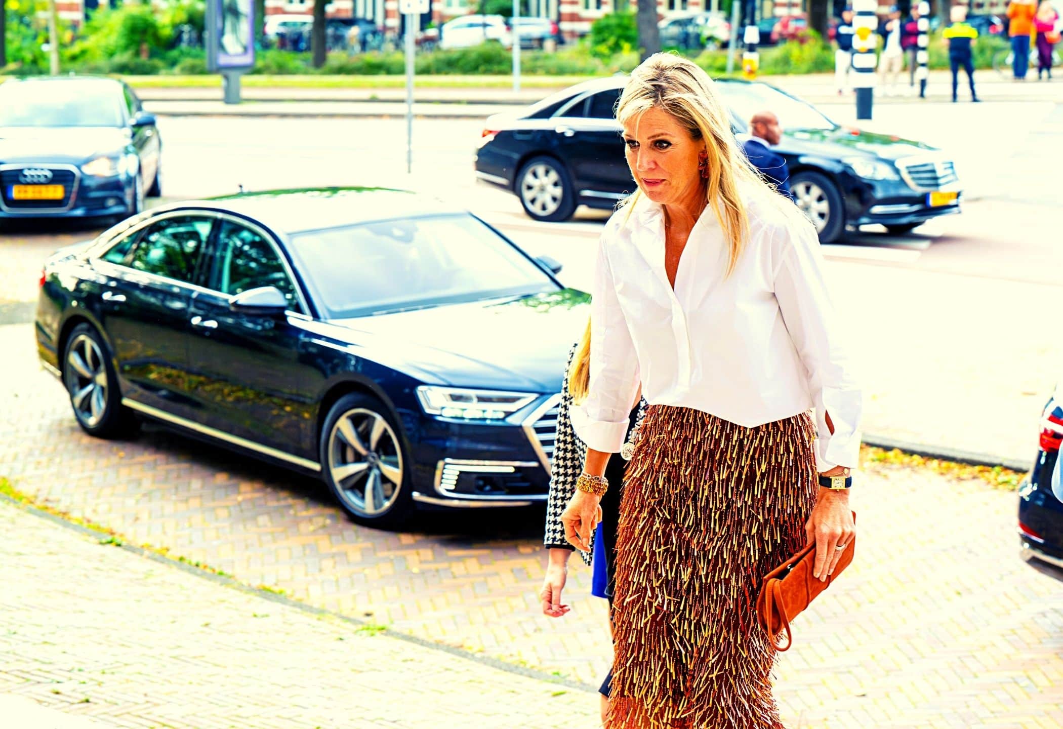 Koningin Máxima schitterde letterlijk in een nieuwe rok, bij het Koning Willem I-diner voor ondernemers in Amsterdam.