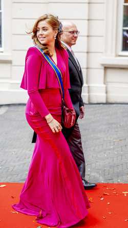 Alexia shinet in fuchsia roze. De jurk is een ontwerp van Zhivago. Net als Amalia en Máxima draagt Alexia vandaag de koningsblauwe sjerp, oftewel: het Ordelint en de Ster van het Grootkruis der Orde van de Nederlandse Leeuw. Verder spotten we bordeauxrode leren handschoenen en een handtas in eenzelfde kleur. Haar haardecoratie is er eentje van Máxima, maar dan vermaakt.
