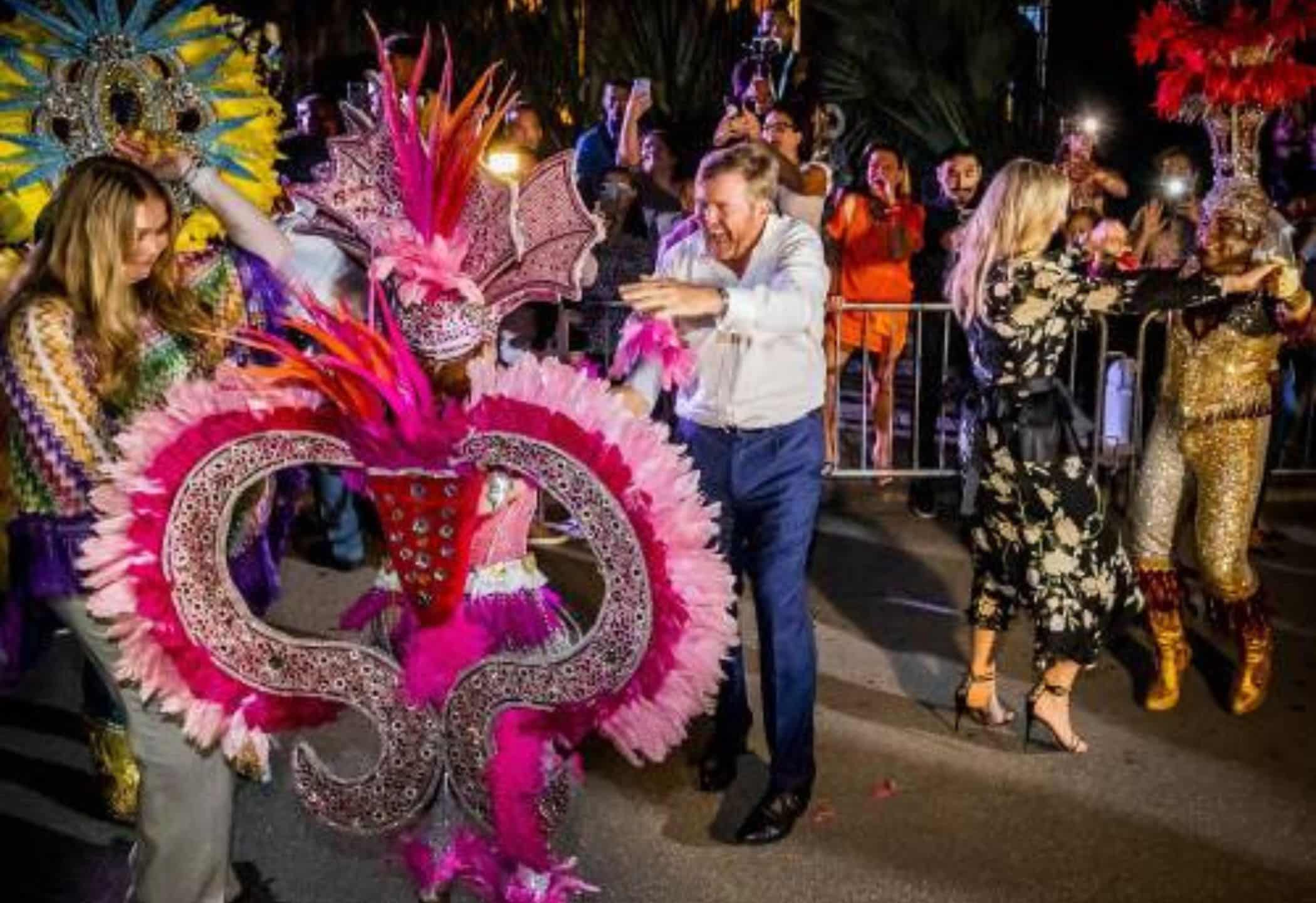Tijdens een carnavalsoptocht op het Bon Bini Festival in Oranjestad dansten het koningspaar en de prinses vrolijk mee door de straten, zoals omstanders en Nederlanders waarschijnlijk nog nooit eerder gezien hebben.