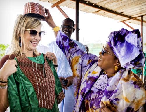 Waar de koningin maar komt op haar reis in Afrika, overal wordt ze bedolven onder de cadeaus.