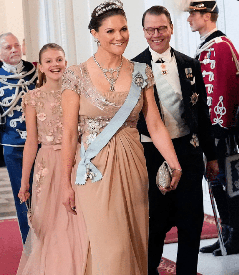 De jonge prinses (11) verscheen op het royal verjaarspartijtje in Denemarken net als moeder Victoria in een nudekleurige jurk. En wát een prachtige dames! Beiden in een prinsessenjurk die hen op het lijf geschreven is. Kijk ook even naar de prachtige bloemapplicaties op het lijfje van Estelle.