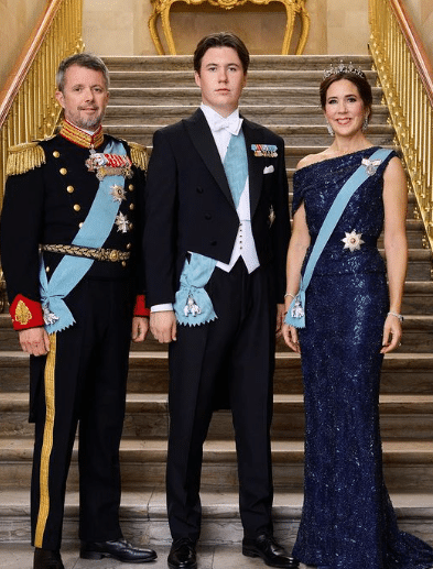 Toen Christian van Denemarken 18 werd, werden er natuurlijk nieuwe foto’s gemaakt. Hier zien we moeder Mary in een to-die-for form-fitting donkerblauwe, fonkelende jurk. Leuk detail is de asymmetrische top: 1 schouder is bedekt, de ander bloot.
