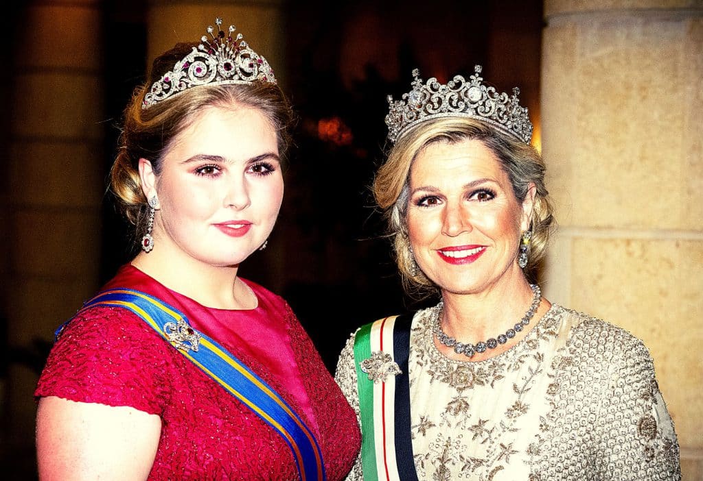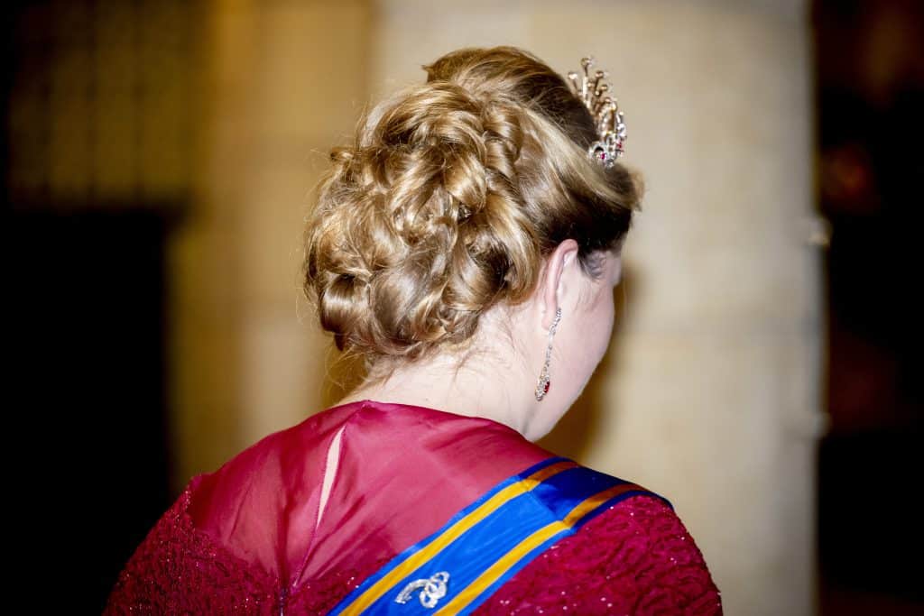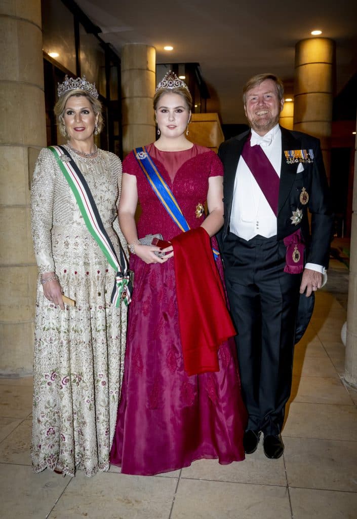Amalia was bij de huwelijksvoltrekking met haar vader, koning Willem-Alexander en koningin Máxima, haar moeder. De kroonprinses droeg een lange, rode jurk van Taminiau, en had haar haren in een kunstige bundel laten kappen.
