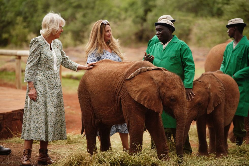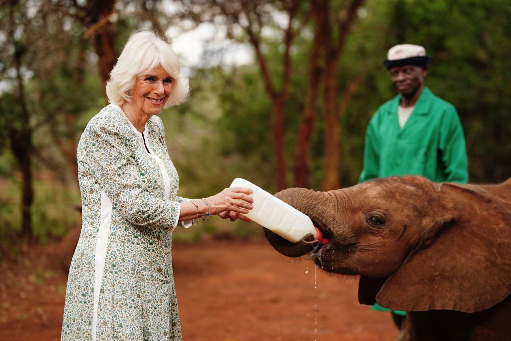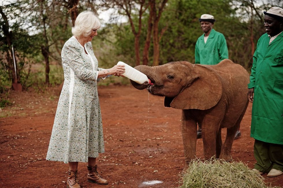 Tijdens de tweede dag van het staatsbezoek van de Britse royals aan Kenia, ruilde koningin Camilla haar baljurk in voor een eenvoudige jurk en platte laarzen om een babyolifant in het wild te voeren.