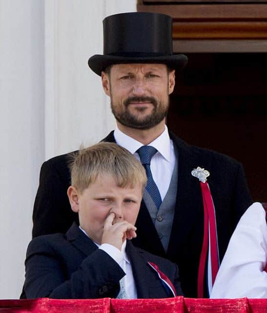 Toen de jonge prins nog een stuk jonger was, werd-ie gekiekt met z’n vinger in z’n neus. Vader Haakon heeft ook niet het meest mediawaardige koppie hier. Hilarisch duo!