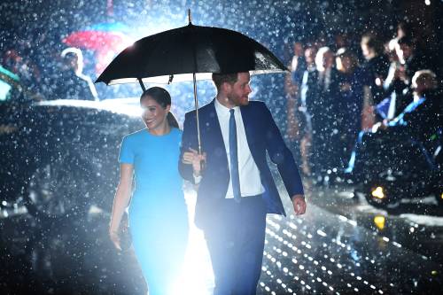 Deze foto van Meghan en Harry onder een paraplu springt eruit. Meghans blauwe jurk en het felle licht van een flitser maken de foto inconisch. De fotograaf vertelde het verhaal erachter.