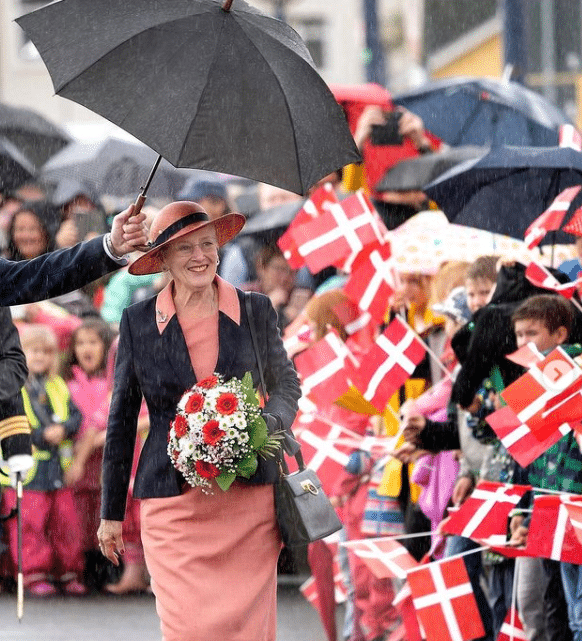 De sympathieke koningin van Denemarken, Margrethe, deinst niet terug voor wat druppels. Net als zoon Frederik hierboven wordt ze opgewacht door enthousiaste fans.