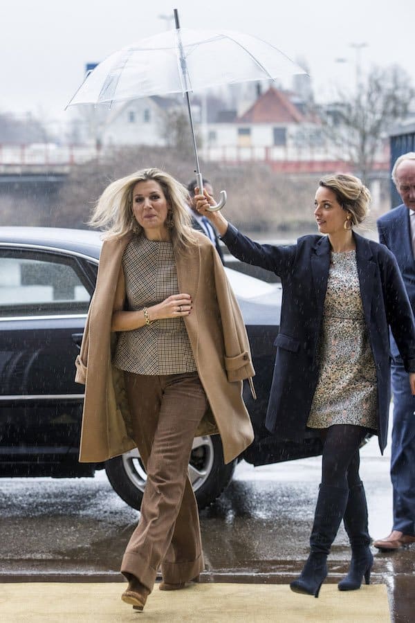 Máxima is inmiddels allang gewend aan het Nederlandse klimaat. Dus helemaal geen reden om níét te stralen bij dit werkbezoekje op een natte dag.