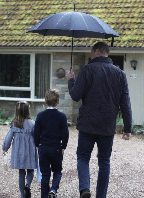 Aandoenlijk! Papa William met dochter Charlotte en zoon George, onder de paraplu. Dit kiekje werd gemaakt door Kate.