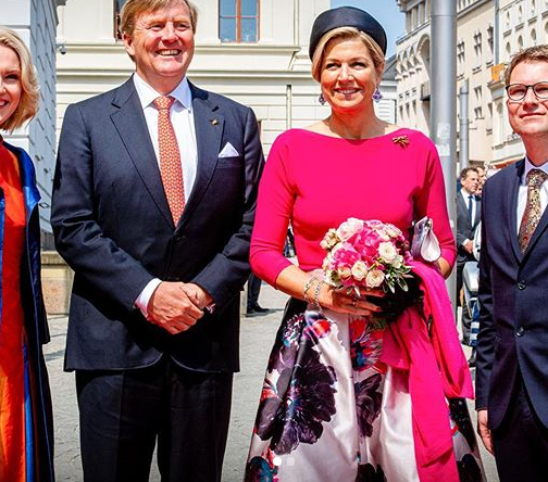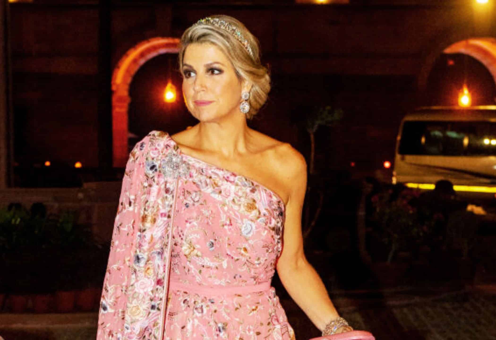 Een fuchsia-roze top boven een zijden rok met bloemenprint. Onze koningin ziet eruit om door een ringetje te halen.