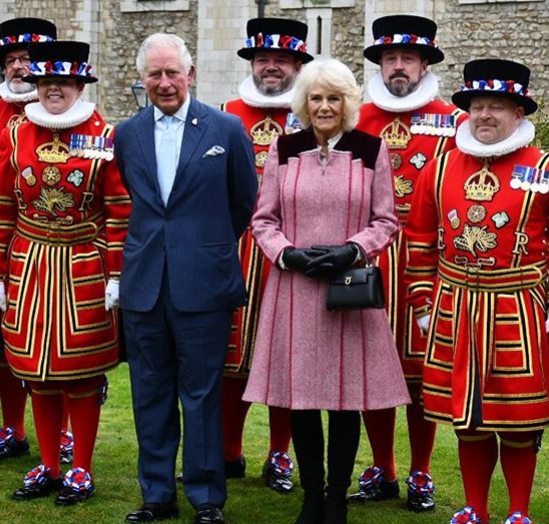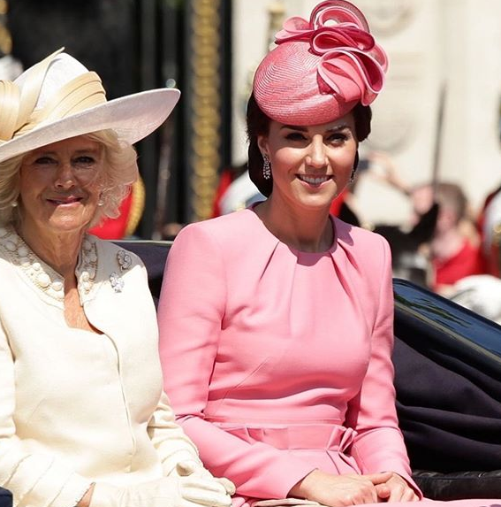 Camilla verrast met een erg modieuze snit, een prachtige oudroze jas.