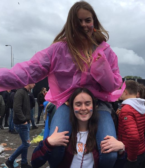 Eloise neemt het zekere voor het onzekere en gaat voor een roze regenjas. Al zit ze zo te zien al ‘hoog en droog’ op de schouders van haar vriendin.