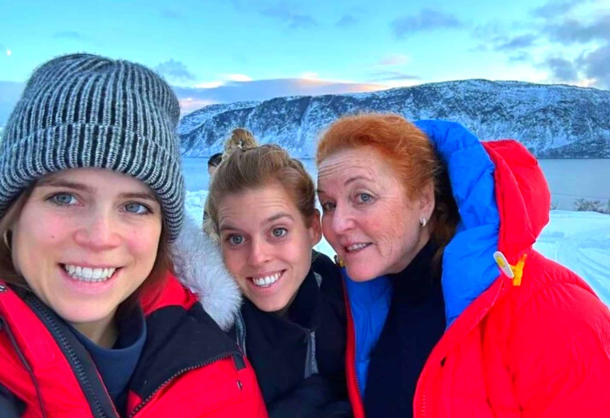 We zien de zwangere Eugenie, haar zus Beatrice en moeder Sarah Ferguson in een zeer winters landschap.