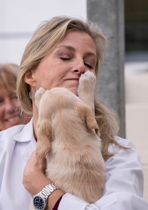 De hertogin van Edinburgh is wel het een en ander gewend aan dergelijke enthousiaste begroetingen wanneer ze trainingscentra in het hele land bezoekt. Sophie en haar gezin hebben twee huisdierenhonden en een schildpad die volgens prins Edward ‘eigenlijk het huis runt’.