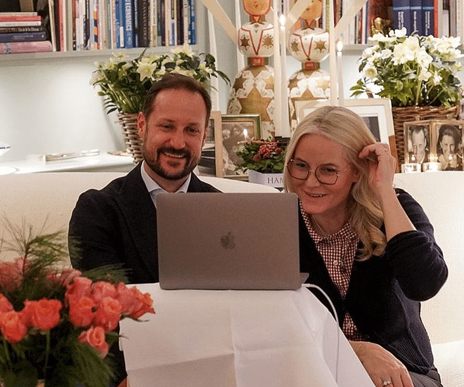 En hier een recente foto, het stel thuis aan het werk tijdens de pandemie. Leuk leesbrilletje, Mette-Marit!