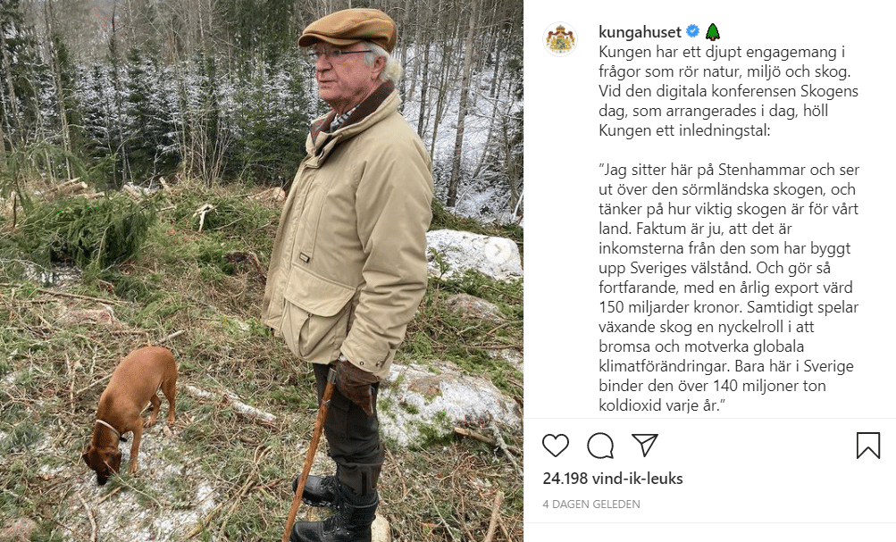 Hij legt meteen een linkje naar zijn interesse in alles dat met natuurbehoud en -bescherming te maken heeft. De Zweedse bossen zijn in staat jaarlijks zo’n 140 miljoen ton aan koolstofdioxide op te nemen. Waardevol en belangrijk om de aarde leefbaar te houden. Carl Gustaf nam deel aan een digitale conferentie over klimaat en milieu, ‘Skogens Dag’ heette dat.