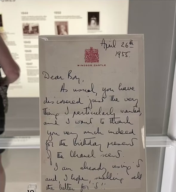De prinses zal ongetwijfeld geïntrigeerd zijn geweest om één klein item in het bijzonder te zien tussen de vele prachtige artefacten van het beroemdste modehuis ter wereld: een brief van haar eigen grootmoeder, de overleden Koningin Elizabeth II. De brief was geschreven om haar man’s stafchef te bedanken voor de Chanel No. 5 parfum die zij als geschenk kreeg.