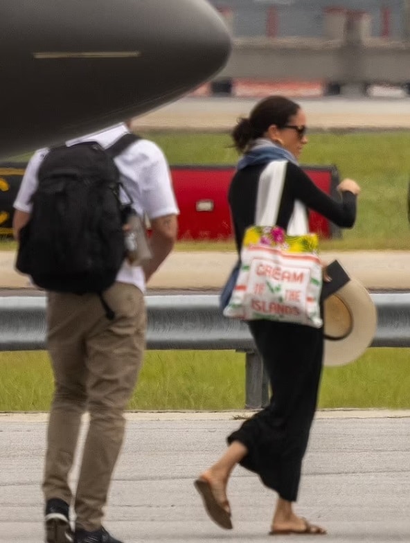Meghan was duidelijk voorbereid op het koelere weer in Atlanta en droeg een zwarte maxi-jurk met lange mouwen, bruine instapsandalen en een blauwe sjaal. Ook had ze een zonnebril op, had ze haar haar opgestoken in een rommelige knot en droeg een souvenir-tas met de woorden ‘Cream of the Islands’ erop, terwijl ze een zonnehoed vasthield.