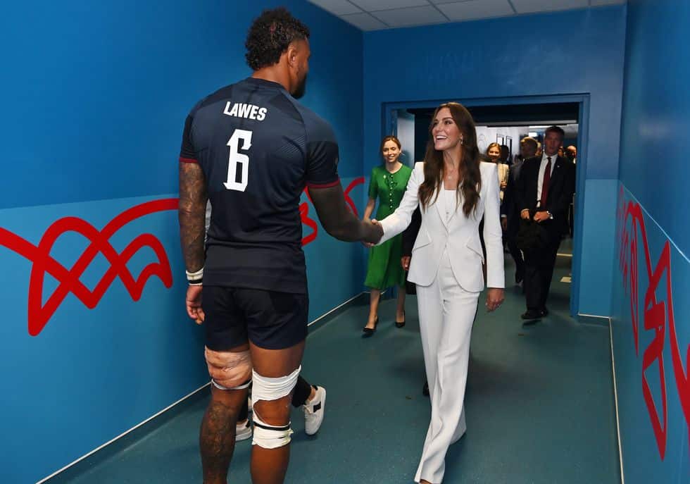 Kate, beschermvrouwe van de Rugby Football Union, volgt de wedstrijd zonder haar man prins William, beschermheer van de Welsh Rugby Union. William zal aanwezig zijn bij de opening van Wales tegen Fiji in Bordeaux.