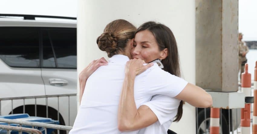 Letizia, gekleed in een frisse witte outfit met een spijkerjasje, stond samen met andere familieleden op de kade te wachten totdat het schip aanlegde. Zodra Leonor aan land kwam, volgde een warme omhelzing tussen moeder en dochter. Ze lachten, praatten bij en genoten zichtbaar van elkaars gezelschap.