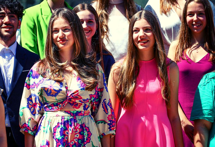 Prinses Leonor droeg een vrolijke bloemenprint in paars en fuchsia. Prinses Sofia hield het bij een mouwloze minijurk, ook maar dan puur in fuchsia.
