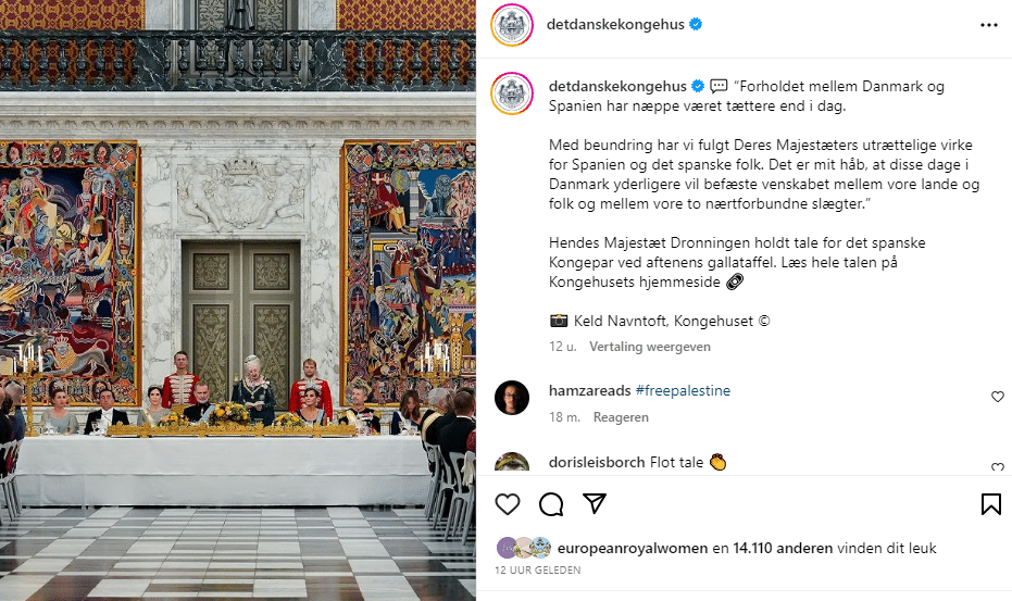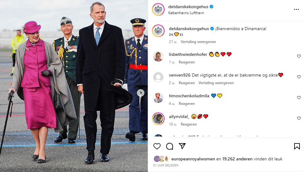 Op uitnodiging van de Deense koningin Margrethe (83) zijn Felipe en Letizia in Denemarken. Zij zullen zich zeer warm ontvangen hebben gevoeld. De eerste post op Instagram werd voorzien van de tekst “!Bienvenidos a Dinamarca!”, oftewel: Welkom in Denemarken!, in het Spaans.