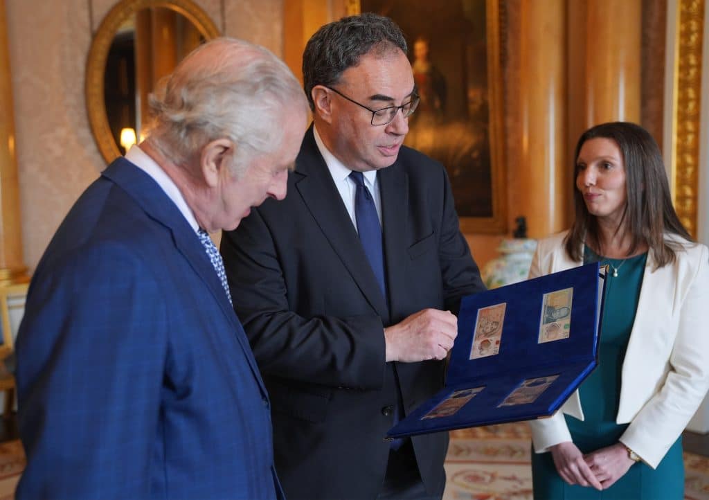 Andrew Bailey, de gouverneur van de centrale bank, bracht een bezoek aan Buckingham Palace om de eerste bankbiljetten met het portret van koning Charles te tonen.