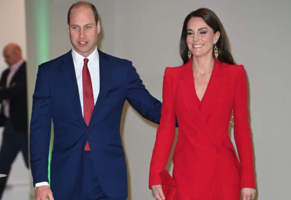Ze maakte ook nog eens indruk met een geweldig broekpak Alexander McQueen: zwarte flares, rode trui, en een asymmetrisch jasje met een winkelprijs van 1.811 euro. Let ook op de bijpassende clutch. En William was er ook bij.