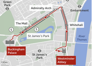De ceremonie zal beginnen met een stoet van Buckingham Palace naar Westminster Abbey. Dit is de route die wordt afgelegd: