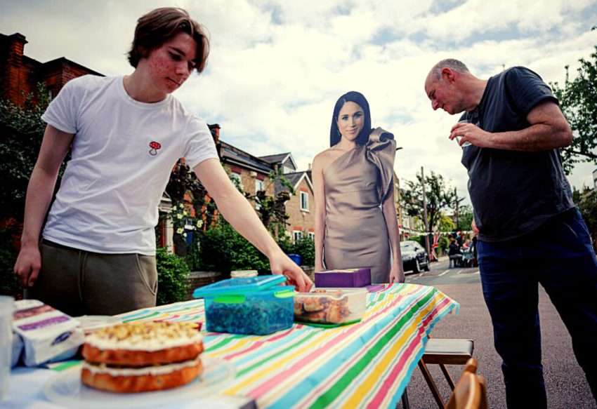 Het gaat dan ook om een levensgrote kartonnen cut out van Meghan. Zondag waren overal in het VK straatlunches. Gezellig met de buren een hapje en een drankje, ter ere van de nieuwe koning en koningin.