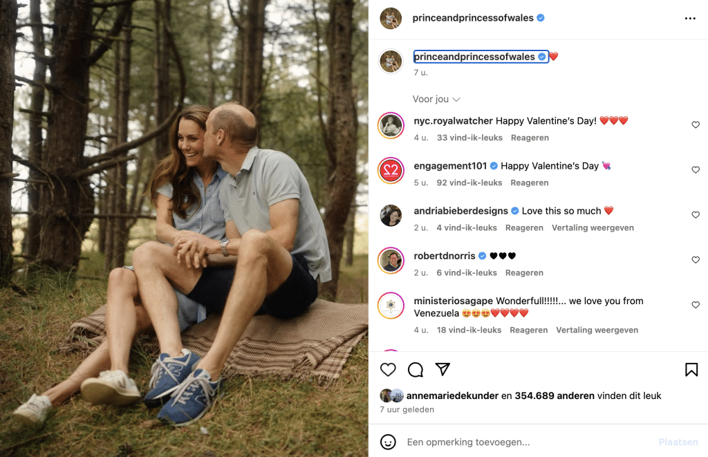 Prins William (42) en prinses Kate (43) hebben ter gelegenheid van Valentijnsdag een romantische foto gedeeld op Instagram. Op de foto zitten ze samen op een kleedje in het bos, terwijl William zijn vrouw teder een kus op de wang geeft.