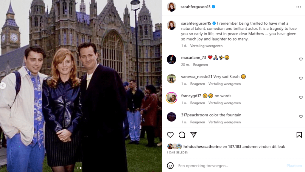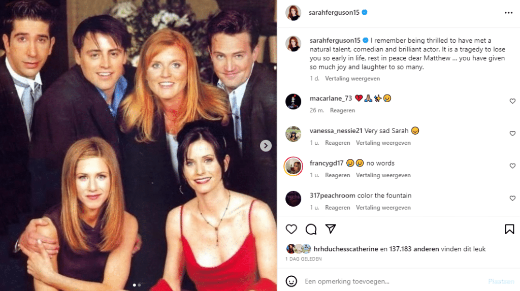 De wereld reageerde geschrokken toen het nieuws naar buiten kwam. Eén van zes ‘Friends‘, Matthew Perry, overleden. Van een eventuele reünie met de voltallige cast kan nu nooit meer sprake zijn. Ook bekende mensen, waaronder royals, delen hun verdriet over zijn overlijden. Op social media bijvoorbeeld. Sarah Ferguson is zo iemand die de acteur niet snel zal vergeten.
