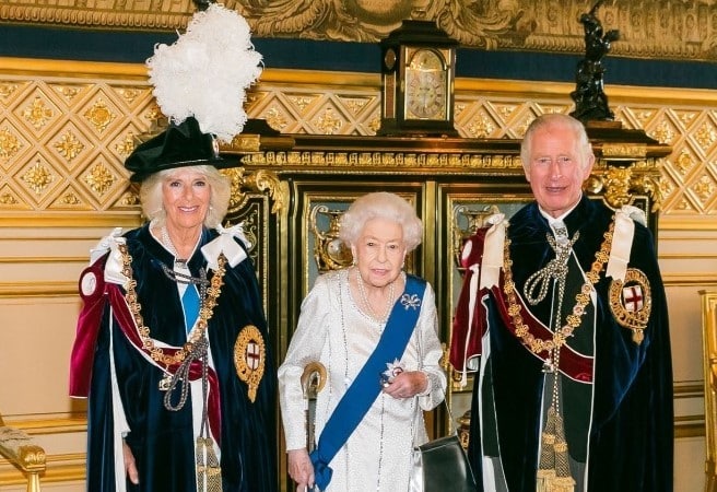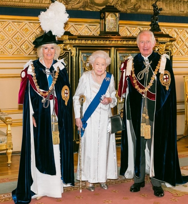 De koningin was nadrukkelijk aanwezig op Garter Day, en liet zich fotograferen naast zoon Charles en schoondochter Camilla, kersvers opgenomen in de Meest Nobele Orde van de Kousenband.